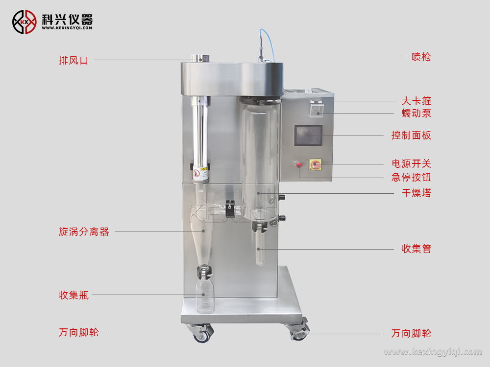 整機全不銹鋼制作;二流體噴霧的霧化結構,噴霧、烘干及收集系統(tǒng)采用透明的優(yōu)質高硼硅耐熱玻璃材料制造